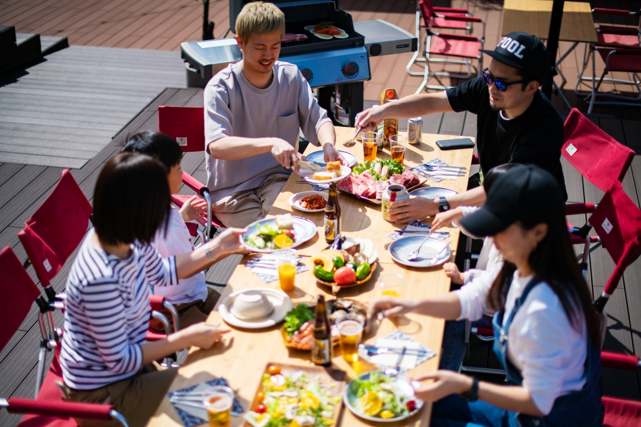 青空の下でBBQを楽しむお客様をサポートする
